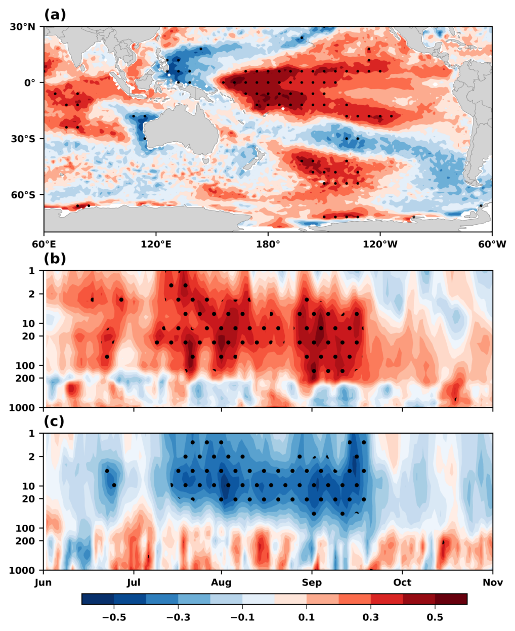南极平流层极涡是控制南半球气候变化的重要动力系统,其强度和结构变化会影响南半球中高纬度天气以及极地臭氧分布。然而,南极平流层变化的可预测性仍然有限,尤其是跨季节尺度上的影响机制尚不清楚。本研究基于1980—2024年ERA5再分析资料,系统分析了热带太平洋海表温度异常与南极平流层环流之间的联系。研究发现,当北半球冬季热带中太平洋(Niño4区)出现暖海温异常时,在随后的南半球冬季(7—9月)通常会出现南极平流层温度升高、平流层极涡减弱并向极区收缩和极地臭氧浓度增强。相反,当海温出现冷异常时,南极平流层则更容易出现降温并伴随极涡增强。