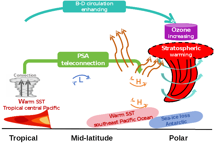 分析表明,北半球冬季热带中太平洋海温异常引起强烈的对流活动,通过激发太平洋—南美(PSA)遥相关波列并向南传播影响中纬度大气环流并增强准定常行星波。随着季节的演变大气环流异常还会引起南极阿蒙森海和罗斯海区域的海冰显著损失,海冰的损失持续至南半球冬季,进而维持行星波的强度,最终扰动南极平流层极涡和引起平流层增温。进一步的回归分析表明,结合冬季Niño4海温指数和PSA环流指数,可以解释约32%的南极平流层温度变化。这一结果表明,热带海温异常能够为南极平流层变化提供重要的跨季节前兆信号。该研究深化了对热带—极地气候遥相关机制的认识,为提高南半球气候预测能力以及理解南极平流层动力过程提供了新的科学依据。