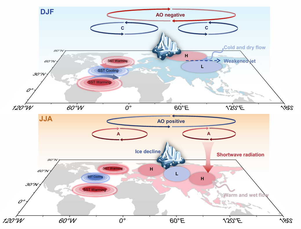 图2. 北大西洋海—气相互作用与北极冰—气耦合协同驱动欧亚冬—夏温度异常反转的物理机制示意图。冬季(上):北极涛动处于负位相,中纬度西风急流减弱,极地冷空气向南侵入,导致欧亚大部气温偏低。同时,北大西洋海温呈现暖—冷—暖的三极型分布,巴伦支海—喀拉海海冰偏少。夏季(下):北大西洋三极型海温异常与北极海冰偏少持续存在,协同驱动大气环流向北极涛动正位相转变,欧亚夏季气温偏高,从而形成欧亚冬—夏跨季节温度异常反转。