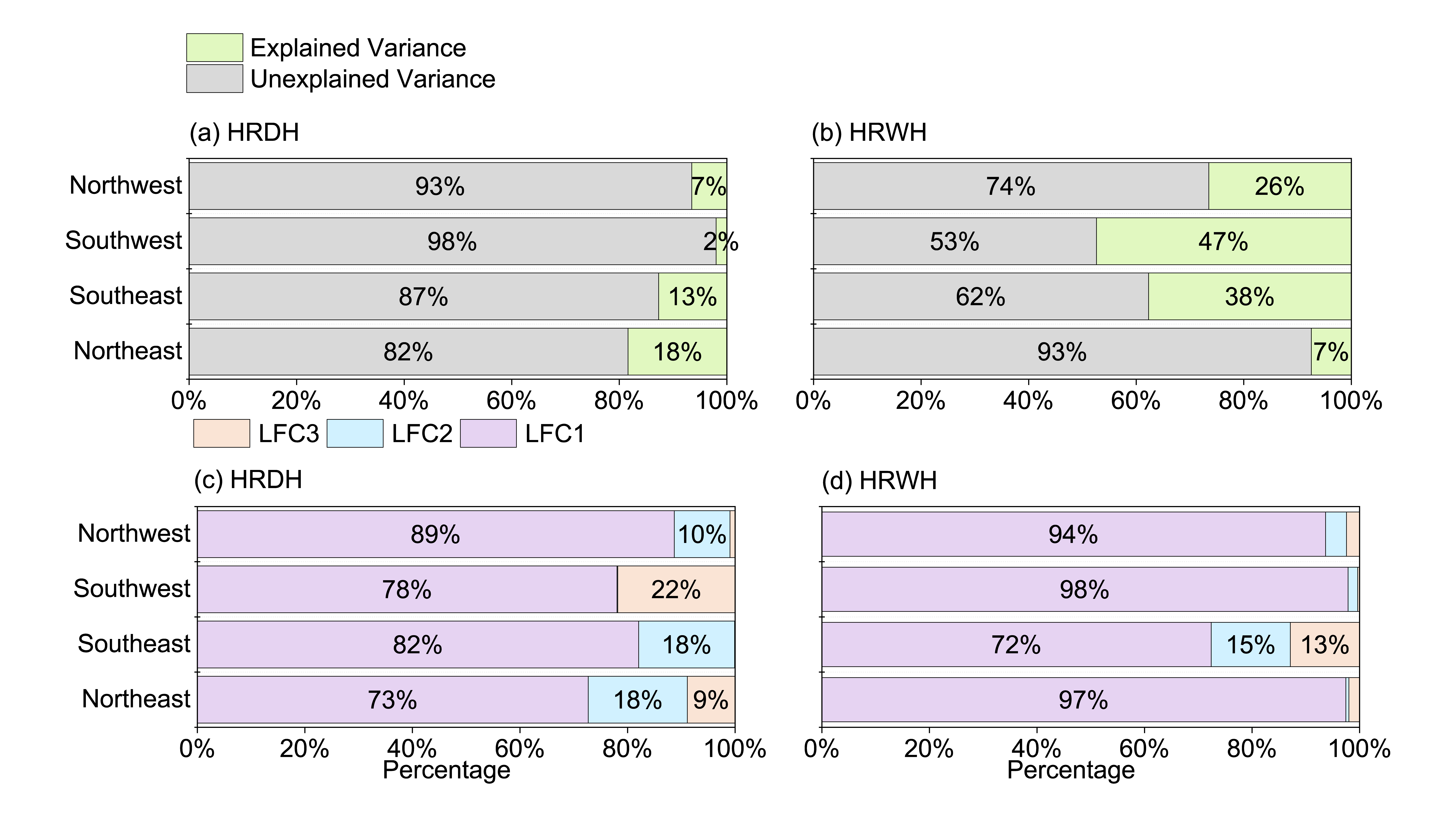 注:(a)海温信号对高风险干热事件的总贡献(绿色:可解释贡献,灰色:不可解释贡献);(b)同(a),但为高风险湿热事件;(c)不同时间尺度海温信号对干热事件的相对贡献(紫色:长期信号;蓝色:年代际信号;橙色:年际信号);(d)同(c),但为高风险湿热事件
