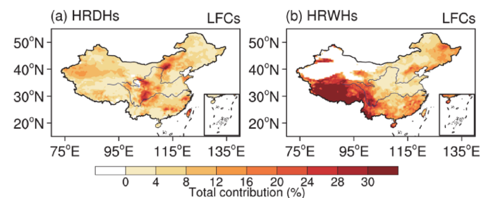 研究发现,冬季太平洋海温对中国湿热型高风险事件的贡献更大(7–47%),尤其是青藏高原地区,而对干热型高风险事件的贡献较小(2–18%);其中海温长期增暖信号是主导因子,在对两类事件的贡献中占比均超过72%(图1和2);从未来模拟结果看,减排可以缓解未来由太平洋海温变暖驱动的热健康风险,而且这种缓解效应会随时间推移而增强。到本世纪末,低排放情境下,中国夏季受太平洋海温长期增暖影响的高风险干热事件频率将减少0.9-2.4天/月,高风险湿热事件频率将减少2.6-11.3天/月,相较于高排放情景有明显下降(图3)。
