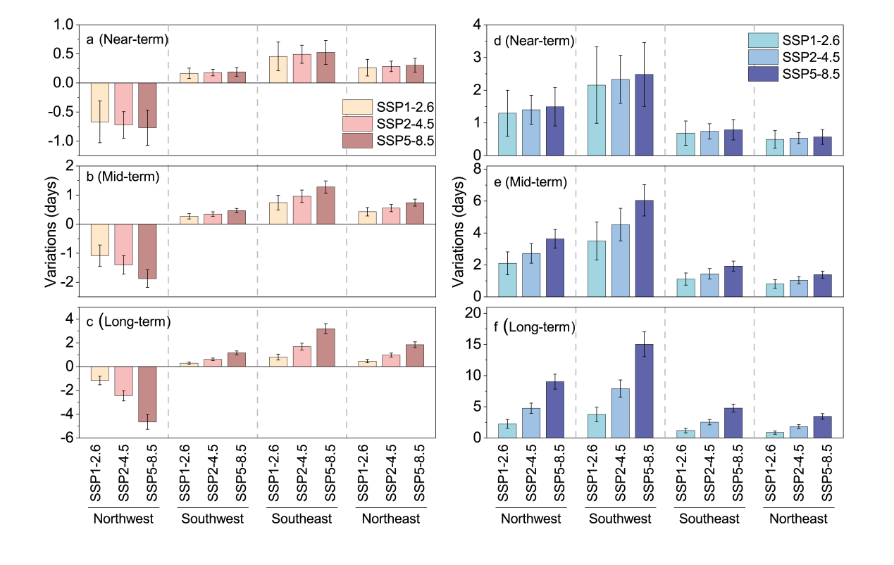 注:(a)近期(2024-2040年)、(b)中期(2041-2060年)和(c)长期(2081-2100年)不同情景下高风险干热事件月频数变化;(d-f)同(a-c),但为高风险湿热事件;误差线表示95%置信区间