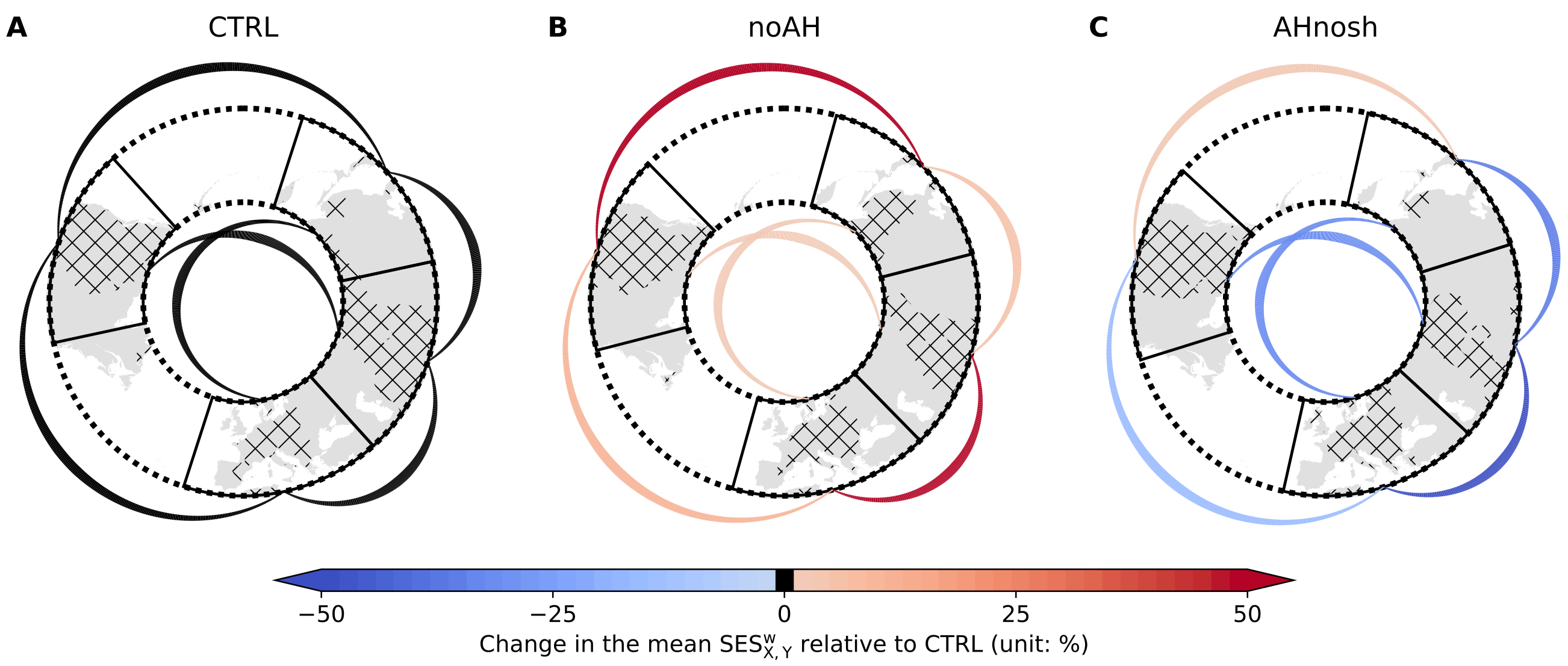 图2 复杂网络检测热浪热点区域间的同步性。CTRL为控制试验,noAH为移除亚洲高山区试验,AHnosh为移除热力效应试验。图B与C中红色(蓝色)表示同步性相对于图A即CTRL加强(减弱)。