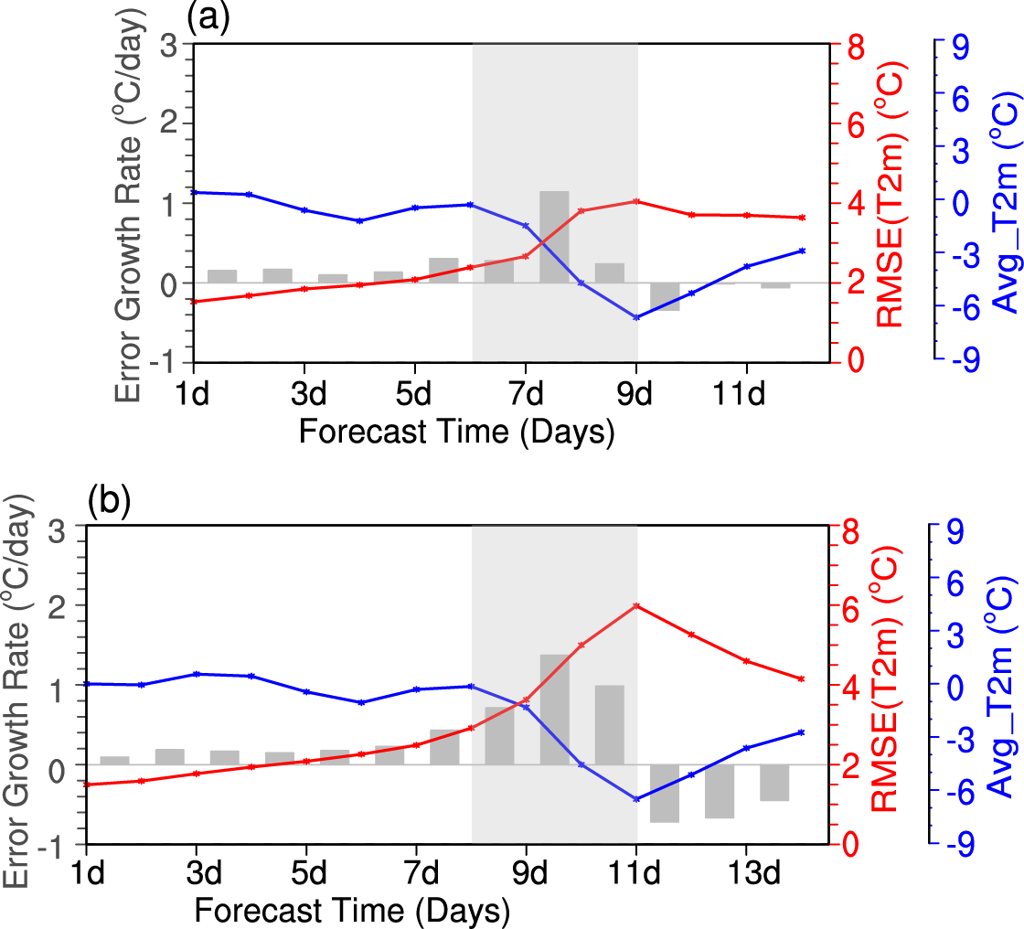 图1 提前事件峰值日9天(a)和11天(b)起报时,中国中东部地区(23°–40°N,105°–123°E)区域平均的T2m集合平均RMSE(红线,右侧红色坐标轴;单位:°C)和误差增长率(灰色柱状图,左侧坐标轴;单位:°C/天)随预报时间的演变情况,蓝线为观测T2m异常(右侧蓝色坐标轴;单位:°C),灰色阴影区域表示事件增强阶段,预报数据来源于ECMWF。