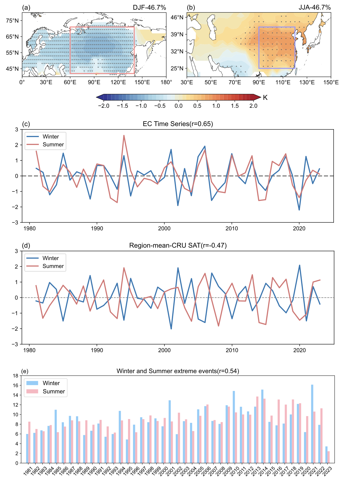 图1. 欧亚冬—夏跨季节温度反转的主模态及其演变特征。(a) 冬季地表气温距平SVD第一模态的空间分布(粉色方框表示欧亚北部关键冷区);(b) 夏季地表气温距平SVD第一模态的空间分布(蓝色方框表示欧亚东南部关键暖区)。灰色圆点表示通过95%置信水平显著性检验的区域;(c) SVD第一模态对应的冬季和夏季地表气温扩展系数时间序列;(d) 欧亚北部关键冷区与欧亚东南部关键暖区区域平均地表气温的年际变化时间序列;(e) 欧亚北部冬季寒潮事件与欧亚东南部夏季热浪事件的年际变化时间序列。