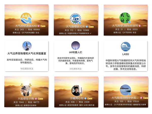 此外,我们还拥有以大气所官方微博和微信公众号为主体,以AAS、AOSL、大气科学等期刊微博公号和各实验室公众号为支撑并整合了科学有温度、行云流水、大脸撑在小胸等大气所科学家自媒体的科普新媒体矩阵,目前粉丝数量达八百余万、年浏览量达两余千万。