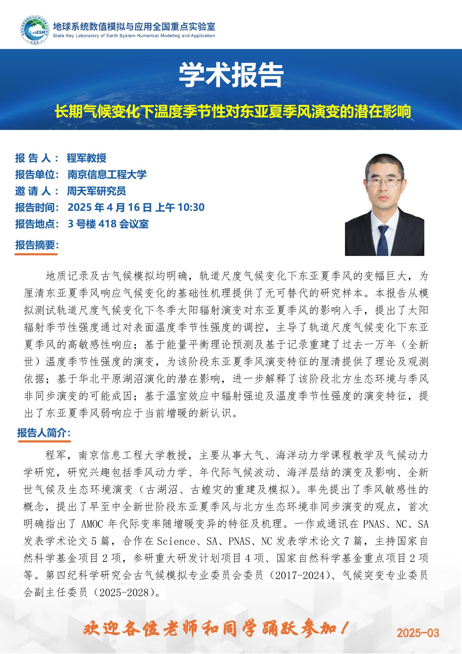 【4.16】长期气候变化下温度季节性对东亚夏季风演变的潜在影响