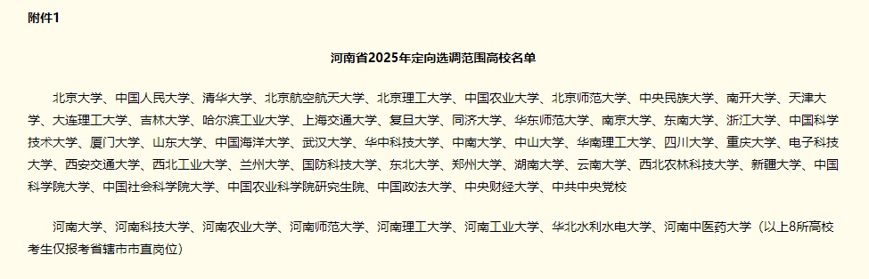 为贯彻落实中共中央组织部《关于进一步加强和改进选调生工作的意见》精神,经研究,决定定向国内部分高校选调2025年应届优秀毕业生到省直、省辖市市直机关工作。现将有关事项公告如下: