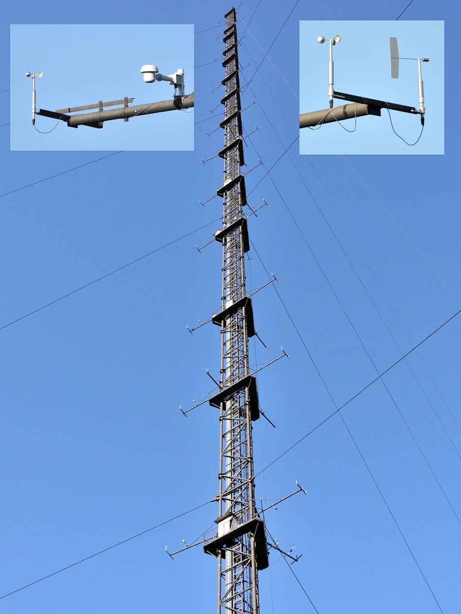 铁塔上主要设备统称为边界层大气观测平台,是一个基于325米气象铁塔的低层大气综合探测系统,集多层、多参量观测系统于一体,实现了 320m 高度内的大气通量、大气成分、气象场等参量的综合自动梯度观测,并可根据不同项目需要增加观测项目。目前日常运行的主要设备包括:1、气象平均场观测系统(15层),每层包括风速/风向、温度、湿度传感器;2、进口湍流通量观测系统(7层),包括数据采集和传输部分、超声风速仪传感器、水汽/二氧化碳传感器;3、超声风速温度仪观测系统(3层),由大气所自行研制而成,进行比对观测;4、大气污染物观测系统(4层),包括紫外光度法臭氧分析仪、脉冲荧光、SO2分析仪和化学发光、NOX分析仪;5、自动气象站观测系统(地面和土壤)、及325米铁塔塔体、电梯升降机等。2012年,该平台获得修购专项仪器设备升级改造项目—“325米气象观测塔系统升级改造”的支持,主要升级改造平均场观测系统、扩展湍流观测系统,并实现超声风速仪水平姿态的实时测量,在2012年底前全部改造完毕。