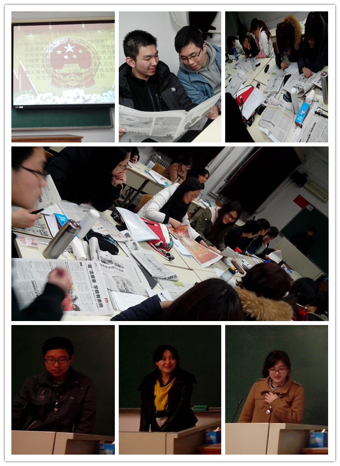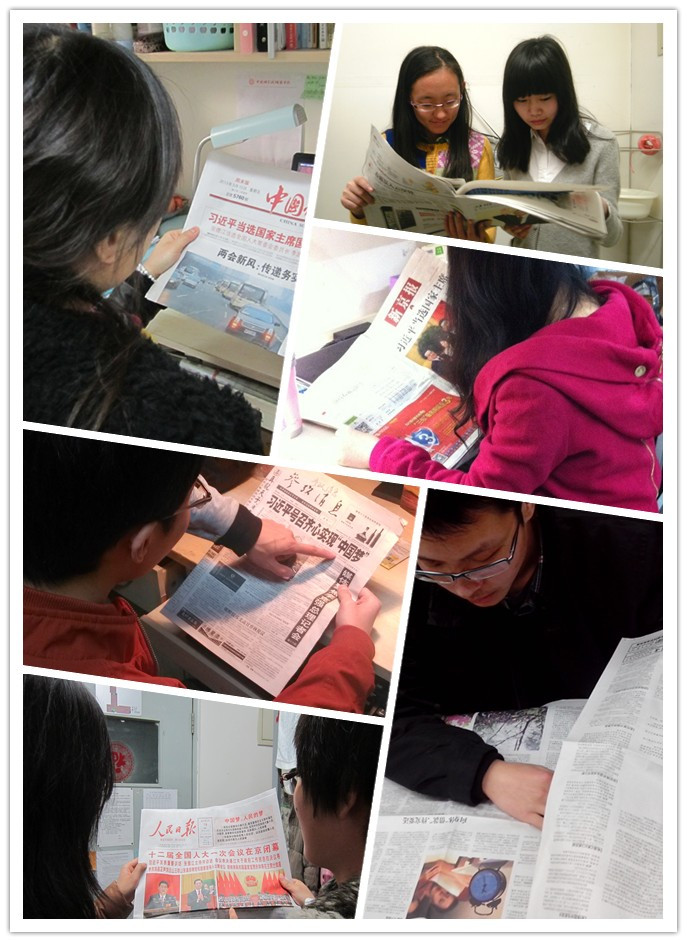两会期间,601支部成员紧跟党的步伐,关心热点动态,每日发送“红色飞信”,各宿舍联系人积极开展本宿舍的读报活动,宿舍成员认真阅读《人民日报》、《参考消息》、《北京晚报》等刊物,了解最新消息,并记录下最想与同学们交流的心得和印象最深刻的热点提案,各宿舍还认真学习了习近平主席3月17日上午在第十二届全国人民代表大会第一次会议闭幕式上的讲话。