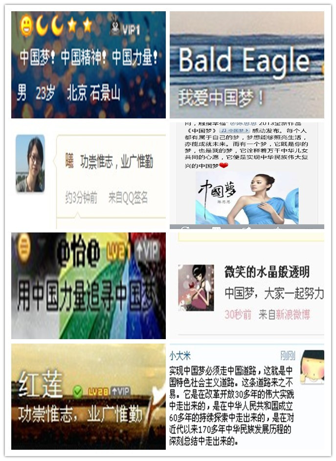 “我们宿舍决定统一思想,把QQ状态改成一样的~ ”在208宿舍全体成员的号召发动下,支部成员纷纷以微博、博客、QQ空间等形式发布动态,响应十八大和两会的精神:“用中国力量追寻中国梦!”、“功崇惟志、业广唯勤!”、“梦想照亮生活,亦能创造未来!”,一时间,同学们纷纷在网上发布自己的理想宣言,有的以“中国梦”作为自己的心情主题,有的发布“说说”感慨身为气象人的责任,有的将推荐阅读的红色书籍在网上和大家分享,还有的号召大家领会两会精髓、好好学习……支部成员决心在实践中共同努力,在中国共产党领导下,为开创中国特色社会主义事业新局面而奋斗。