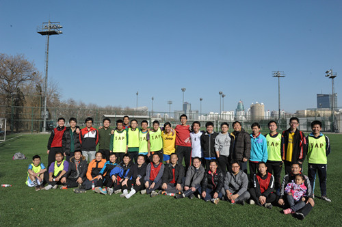 1月1日的北京,阳光明媚,30多名所内外的足球爱好者相约来到奥林匹克体育场。按照规则,大家很快分成了教师队和学生队两支队伍,并排好了上场阵容。上午10:00,比赛正式开始,首先由王会军所长领衔的教师队开球。一开场学生队就展现了强大的攻击力,凭借速度优势,频频威胁教师队的后防线,任诗鹤、谭红建、陈加山和邓建波组成的攻击线在前场积极跑动、灵活换位,很快就由谭红建率先攻入一球,抢得先机。这时教师队才如梦方醒,在做出针对性的调整之后,利用良好的团队意识,逐步控制了进攻节奏。同时,发挥贾炳浩的带球突破能力,教师队多次利用“下底传中”战术威胁学生队大门,无奈学生队体力充沛,补防及时,每每无功而返。学生队后卫忙中出错,解围不远,张勇才抓住机会吊门得手,总比分1:1,暂时缓解了紧张的局势。此后,教师队的进攻运转越来越流畅,中路的短传渗透也卓有成效。虽然陈际龙的远射被横梁拒之门外,赵琦转身抽射也被对方门将没收,但张勇还是以一脚低射洞穿了学生队大门,教师队2:1领先。在中场结束前,陈加山凭借出色的个人能力,带球突破对方数名后卫,才艰难地帮助学生队扳平比分,总比分2:2结束上半场。