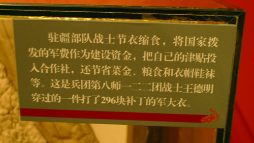60年前我西北几十万大军遵照党中央、毛主席的命令进军新疆歼灭国民党残余后为稳定边陲、社会安定、人民生活幸福在保留部队建制下把工作重心转移到边疆建设、维稳、发展上来。展览展示了建国60年来遵照党中央屯垦戍边事业的光辉路程和辉煌成就,展现了兵团60年在维护稳定和长治久安中做出不可磨灭的历史贡献和不可替代的重要作用。充分体现了我们的人民军队既是战斗队,又是工作队、宣传队的三大任务。当时新疆的环境、条件恶劣是可想而知的。我们驻足在一件补了296块补丁的棉大衣前引起了无限沉思,当年参加兵团建设、三线建设、支边、支教、支农……的人们,在这些特殊战线上他们默默奉献为新中国的建设付出了一生心血,直至如今他们的子孙仍在那里坚守。相比之下,联想到当今社会上的拜金主义、享乐主义的功利思潮,为获取个人或少数人的利益挖苦心思、绞尽脑汁的人显得多么渺小;那些与共产党早以分道扬镳的贪官污吏、腐败分子不能不让人痛恨。现在以习近平为代表的新一届党中央一年多来出台了一系列深得民心的重大举措,我们感到党、国家又有了希望。在我们回首往事、展望未来之时,不能忘记这些为祖国建设、发展、繁荣稳定做出伟大贡献的开拓者。(大气所退休二党支部供稿)