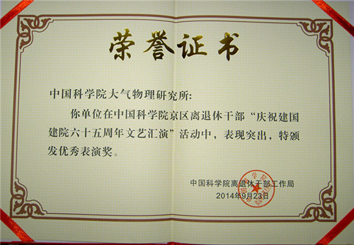 通过演出活动,不仅表达了老同志对中国科学院的礼赞,更是对祖国母亲华诞的颂歌。大气所积极参加此次活动中荣获“庆祝建国建院65周年文艺汇演”优秀组织奖。