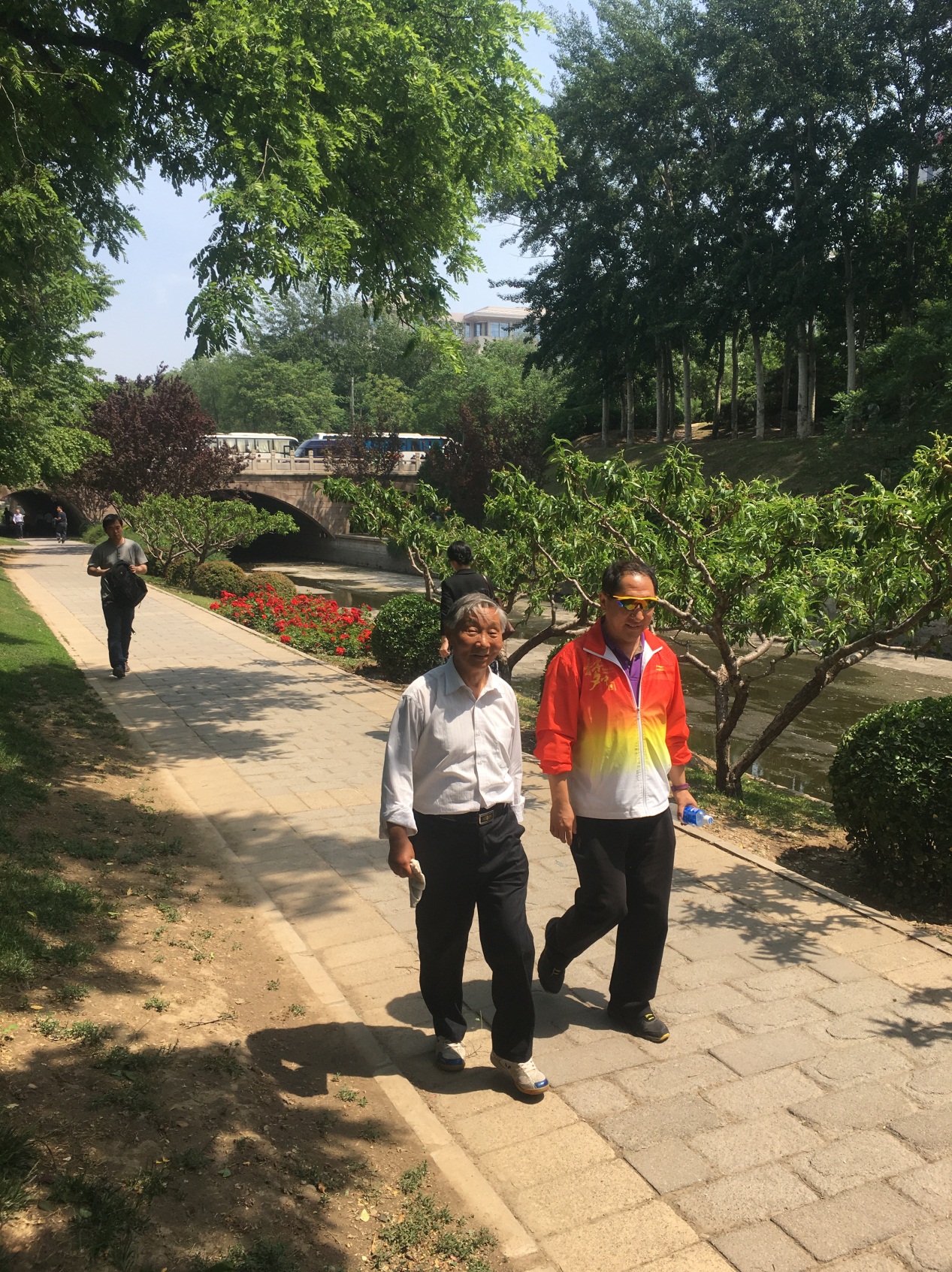 首先,户外协会秘书长李垒带领大家在室内进行了简单的热身运动。15分钟后,大部队浩浩荡荡地向元大都遗址公园挺进。冲锋队长胡朝霞老师迅雷不及掩耳之势地冲在队伍最前面,不一会功夫就消失在大家的视野中。大部队在李垒的带领下大跨步摆臂前进,队伍越来越长,吕院士与赵光宇老师在队伍最后压阵。从健德门桥到樱花西桥来回近4.1公里,小月河贯穿元大都公园,两岸绿树成荫,鸟语花香,河南侧便是元大都城垣遗址。行进中,大家有说有笑,侃侃而谈,仿佛穿越了时空,回到那鞍缰盛世。