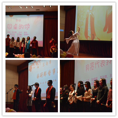 一首由15硕李振和操晚对唱的《小酒窝》拉开了晚会的帷幕,感情真挚、歌声甜美,伴随着台下观众整齐的节拍,晚会氛围渐渐浓厚。搞笑相声《身体健康》,由16硕的黄凯、董自臻表演,两人拿自家班长开涮,一捧一逗,配合默契,包袱频出,逗得台下观众捧腹大笑。欢笑过后,来自16春博邓赟的一支葫芦丝独奏《竹林深处》,又把观众带入到一个幽静无争的世界,曲调悠扬,余音绕梁。14硕也不甘示弱,追忆青春,一首《同桌的你》,由田群、谢志昂伴奏,刘洋等人合唱,勾起了台下观众美好的青春岁月。感悟盛唐韵味,16秋博赵威的古典舞《七秀坊》,舞姿唯美曼妙,衣袂飘飘,赢得台下热烈掌声。集搞笑与讽刺于一体的自编节目《三句半:科研那些事儿》,由15硕党瑞君执导,李文韬等人编剧,周世杰等人表演,深刻反映了同学们衣食住行和学习中遇到的趣事烦心事,形式新颖,语言诙谐,包袱一出,出乎意料,又在情理当中,逗得观众哈哈大笑。16硕马骄等人深情演唱的情歌《月亮代表我的心》则爱意浓浓,感动观众,感动心中的那个人。15硕孙睿藻的笛子独奏《千本樱》,曲调轻快,清新纯洁,给大家带来一场别样的听觉盛宴。14硕李惠心等人表演的舞蹈《darling》,活力四射,动感十足,舞出了研究生们的青春与朝气。