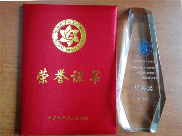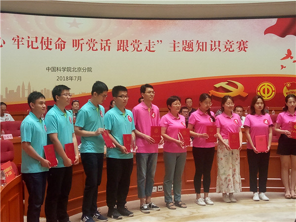 2018年7月6日,大气所选派2名职工和青年学生代表参加了北京分院“不忘初心 牢记使命 听党话跟党走”主题知识竞赛,获得了优秀奖的好成绩,现场知识竞赛检验了学习的效果,掀起了深入学习习近平新时代中国特色社会主义思想和党的十九大精神的高潮。 (所工会供稿)