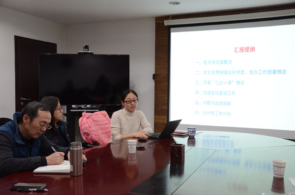 按照所党委的要求,肖淑芬报告了2018年机关党支部的工作情况,报告主要分6个方面,分别为机关党支部概况,党支部贯彻落实所党委、党办工作部署情况,开展“三会一课”情况,完成各项基础工作情况,存在的问题与改进措施,2019年工作计划等。2018年机关党支部的工作得到了所党委和其他党支部的肯定,在党建工作考评中获得优秀。但还存在政治学习如何提高党员兴趣、如何创新方式高质量完成全年工作等问题。2019年,机关党支部将继续深入开展“双融双聚”主题实践活动,加深同所内各党支部和所外相关领域党支部的融通融合,促进了解,开阔眼界,学习先进管理方式,提高管理工作水平。肖淑芬代表支委给各位党员送上了美好的节日祝福。