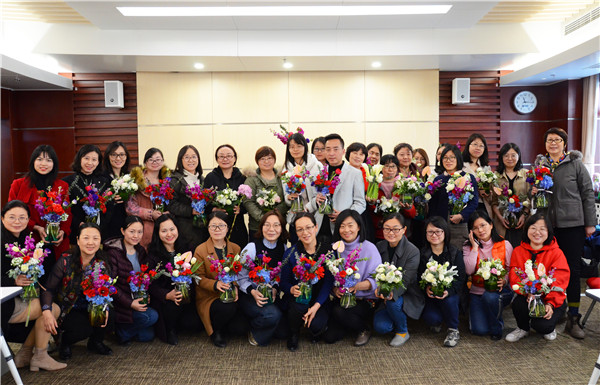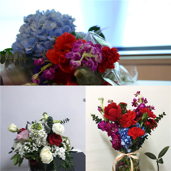 花漾时光主题花艺活动,特邀谢军老师现场讲授插花知识及插花技法。谢老师向大家细致地讲解了插花的基本要求和方法,提升审美保持观赏性等方面的技巧;现场演示并一一互动。到场的女同胞在老师的指导下,用自己灵巧的双手,利用花材,整合造型,用老师的方法巧手修剪后,错落有致地搭配起来,插出风格迥异的漂亮花束,或诗情画意,或高雅格调、或清新怡人……面对自己的作品,每个人脸上都洋溢着欢乐的笑容,流连在春天的气息里,鲜花带来的小确幸,呈现着自己精彩的作品,互动着美丽动人的瞬间,记录着幸福快乐的花点时光,用五彩缤的鲜花点亮了“女神节”!