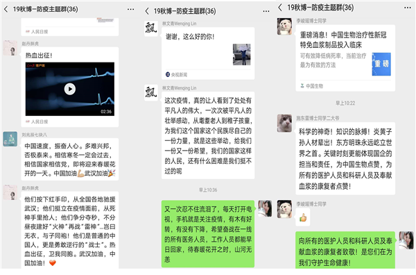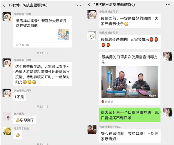 为响应研究生党总支发挥党员、学生干部带头和朋辈带动作用的号召,根据研究生党总支的工作部署,19秋博党支部于2月8日建立“19秋博-防疫主题微信群”,构建积极有效的线上防疫宣传机制,班长、党支部委员带动全体同学分享疫情最新信息,防疫措施,感人事迹,同学们反馈热烈,积极向亲友转发防控知识,传递正能量,汇聚力量,共同战“疫”。