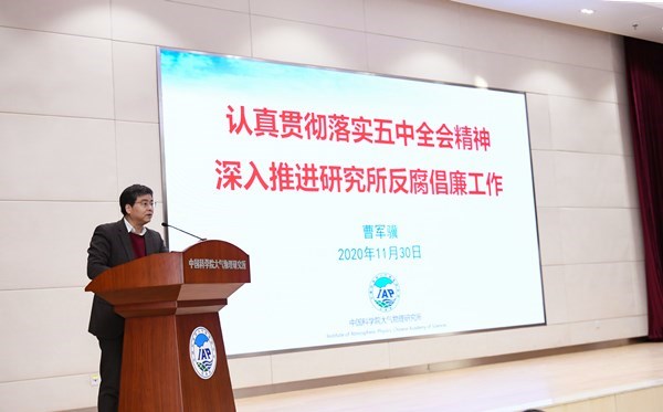 所长曹军骥做了题为《认真贯彻落实五中全会精神 深入推进研究所反腐倡廉工作》的报告。报告介绍了我院全面从严治党的新形势。根据中央第十五巡视组巡视中国科学院时发现的问题和提出的整改要求,中科院党组召开巡视整改专题民主生活会,白院长做出了重要指示,提出了下一步工作的新要求,全院从“四风”问题专项整治、规范科研经费管理和使用、车辆管理自查自纠、期刊自查自纠、内部审计等方面开展了专项工作。曹军骥以院内外一些违法违纪案例为例,结合国家对于科研诚信建设的新要求,强调科研人员要提高自律意识,自觉践行新时代科学家精神,珍惜学术声誉,恪守科研规范,坚守诚信底线,强化科研担当,维护风清气正的科研环境,为加快建设世界科技强国,实现中华民族伟大复兴的中国梦贡献力量。