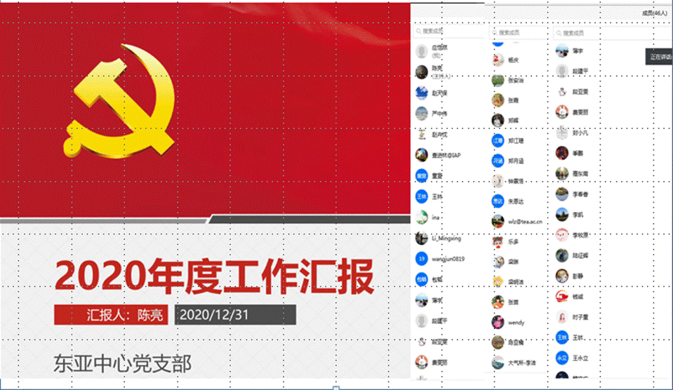 2020年12月31日上午十点,东亚中心党支部采用视频会议形式召开了2020年度工作总结暨党员民主评议会,会议由党支部书记赵天保及副书记陈亮主持。会议主要从党支部概况及换届情况、理论学习开展“三会一课”情况、开展主题党日活动情况、完成党委党办及各项基础工作情况及存在的问题与改进措施等方面进行了详细的介绍。与会党员代表发言,针对自己在本年度的思想学习、科研和学习工作等方面进行了总结,同时开展批评与自我批评,并对自身可能存在的不足提出改进措施。大家一致认为,作为科研人员在兢兢业业做好自己的本职工作的同时,要不断加强政治理论学习,注重政治思想、意识形态、精神文明建设。全体与会党员根据支部成员本年度的表现情况,填写了民主测评表。(东亚中心党支部供稿)