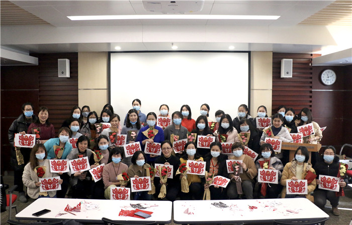 最终,一幅幅漂亮生动难度适中的剪影在大家的手中诞生:两个可爱的女子,一手托着绣着党徽的绷子,一手举着绣花针,把对生活的热爱和对党的崇敬栩栩呈现,智慧在指间流转,灵动在纸端跳跃。大家带着自己的作品,和喜迎三八的花束,为2021“女神节”留下快乐而难忘的记忆。(妇委会供稿)