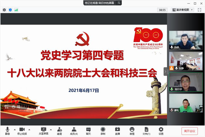 2021年6月17日上午,创新转化基地党支部在淮南园区综合楼党建活动室通过现场会议和腾讯视频会议相结合的形式开展了学习活动,会议由支部书记孙扬主持。所党委书记陆日宇以《党史学习第四专题 十八大以来两院院士大会和科技三会》为主题讲党课,年轻干部理论学习小组全体成员参加了此次学习活动。党课以十八大以来两院院士大会和科技三会上习近平总书记有关科技创新的重要讲话为主要内容,带领大家认真学习领会习近平总书记的重要讲话精神,实现建设世界科技强国的目标作出的重要部署,以及提出的明确要求。陆日宇指出,作为基层党员应该深入理解、学习并掌握中央精神,把握科技创新和发展大势,这对开展相关工作具有重要的指导意义。孙扬表示创新转化基地作为支撑部门,全体成员要从自我做起,从服务做起,积极响应建党百年之际新的号召,为努力实现高水平自立、自强而奋斗。