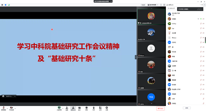 2022年9月30日下午,所党委委员、副所长周天军为LAGEO党支部的党员同志讲党课,作《围绕职责振精神,我为二十大做贡献》的党课报告,带领党员同志集中学习了 “中科院基础研究工作会议精神”和“2022年中科院夏季党组扩大会精神与科技创新相关内容”。会议采取线上线下结合的形式举行,实验室卞建春主任(非党员)线下参加了党课学习。