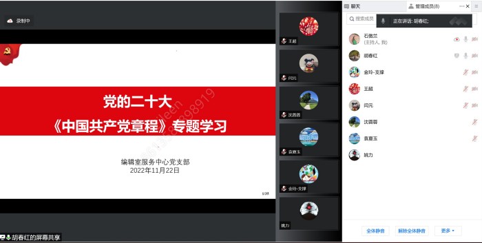 2022年11月22日下午,编辑室服务中心党支部通过腾讯会议召开了党支部大会。会议主要内容:1、学习二十大党章;2、全体党员制定个人行为规范、凝练座右铭;3、案例通报。