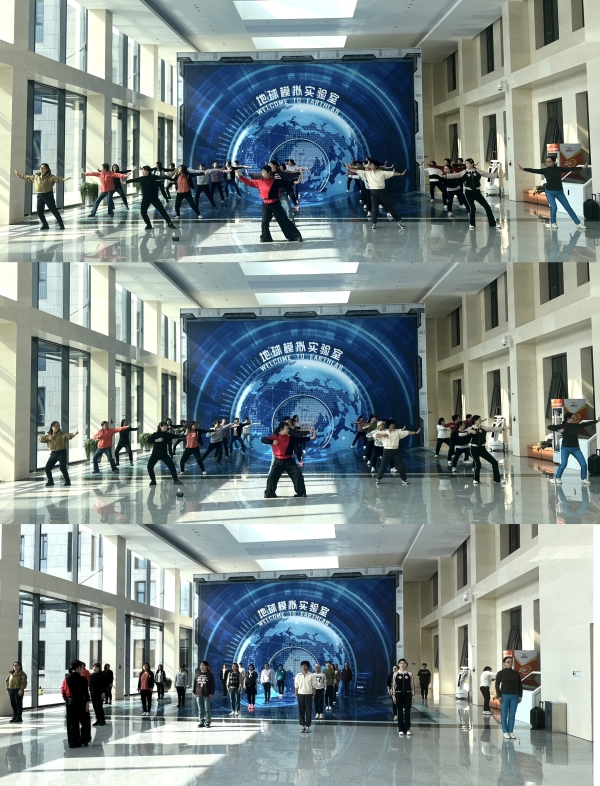 早上8点大家在所东门集合乘车前往大气所密云园区。和煦的秋日里,阳光洒满大气所密云园区主楼大厅,我们迎来了首个精彩亮点——锻炼身心的八段锦学习和操练。站在炫目的地球系统数值模拟装置入口处,跟随教练老师的引导,大家一步一个动作地领略着传统养生之道。一招一式认真学习,一呼一吸细致体会,8节连贯动作让我们感受到动轻气柔,身体微热,筋骨舒展……这套老幼皆宜的八段锦实操不仅有益健康,还令我们深刻领悟到了古老健身之道的奥妙。