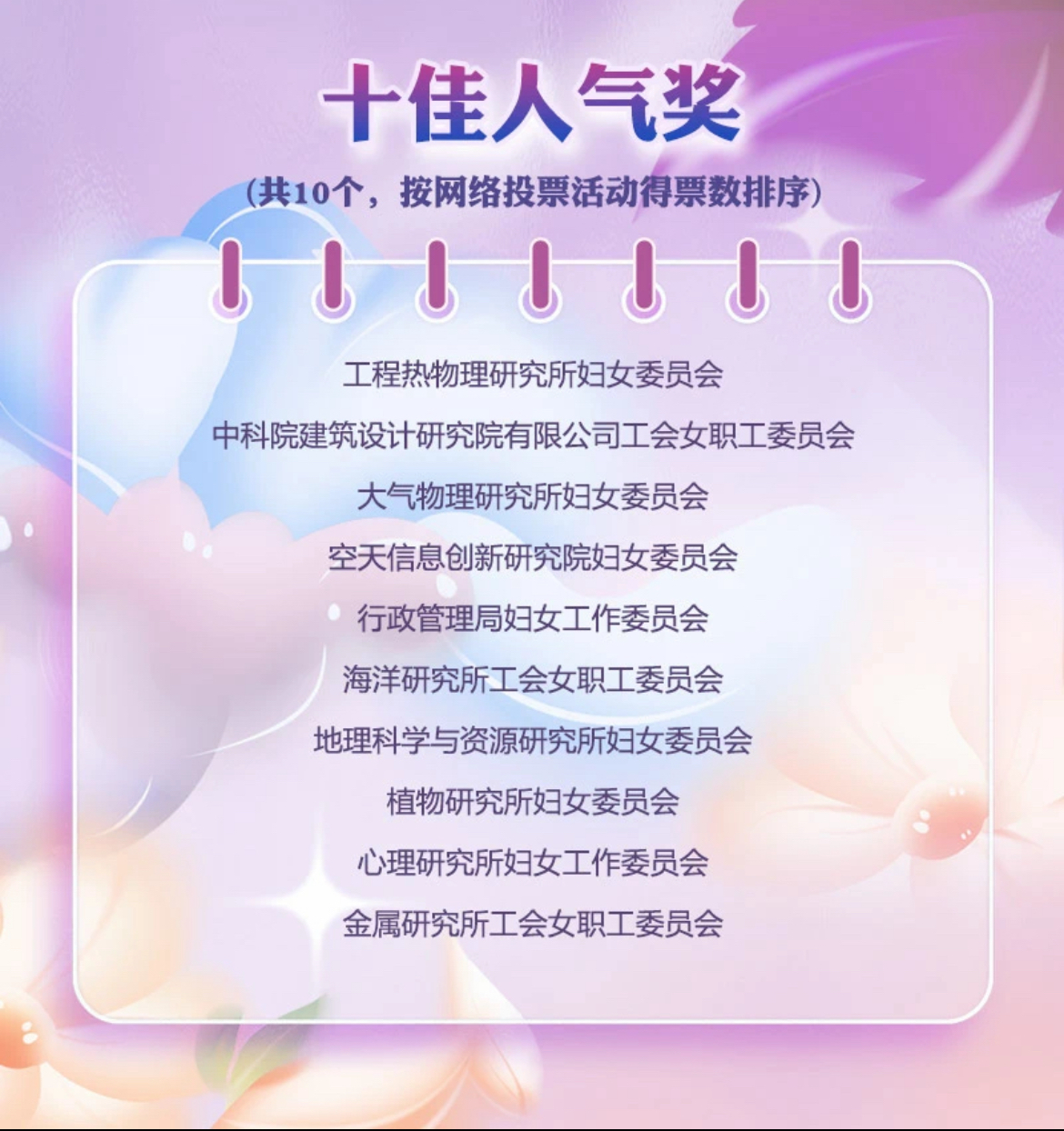 为隆重纪念第114个“三八”国际劳动妇女节,中国科学院妇女工作委员会、中国科学院工会女职工委员会,在全院范围内组织开展2024年“科苑女性活动月”。大气所妇委会响应号召,积极开展了一系列丰富多彩的活动,并在“科苑女性活动月”中取得了优异的成绩。