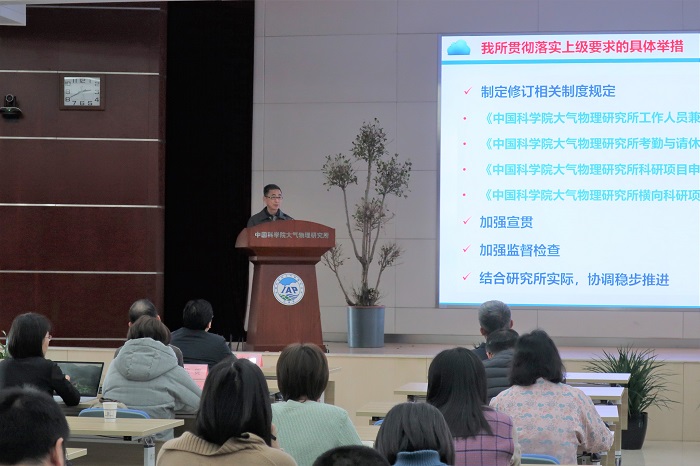 陆日宇作了题为《推进党纪学习教育常态化长效化 努力抢占大气科学科技制高点》的报告,传达了党中央和院党组关于党纪学习教育常态化长效化的文件精神和部署要求,以及中国科学院2024年党委书记工作研讨班的会议精神,对我所贯彻落实相关要求的具体举措进行了说明。他强调,作为国家战略科技力量主力军,我们必须把纪律建设摆在更加重要的位置,特别强调组织性、纪律性,要深入学习贯彻党的二十届三中全会精神,巩固深化党纪学习教育成果,加强政策宣贯和监督检查,协调稳步推进各项改革举措,为抢占科技制高点提供坚强的纪律保障。
