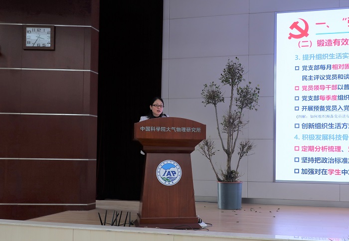 党群工作处处长肖淑芬进行了党支部工作实务培训,传达了中国科学院对党支部“强功能 固堡垒 促攻坚”行动方案、巩固拓展主题教育成果以及加强改进在所期间学生思想政治工作的相关要求,通报了党支部工作手册检查情况,对发展党员、选举、组织关系转接、党费报销等工作中常见问题作了详细说明,分享了对于做好党建工作的思考感悟。