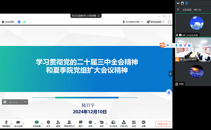 为深入学习党的二十届三中全会精神,2024年12月10日下午,创新转化基地党支部开展专题党课报告会。会议邀请了党委书记、副所长陆日宇以《学习贯彻党的二十届三中全会精神和中国科学院党组2024年夏季扩大会议精神》为题作专题党课报告,会议由党支部书记宋磊主持。
