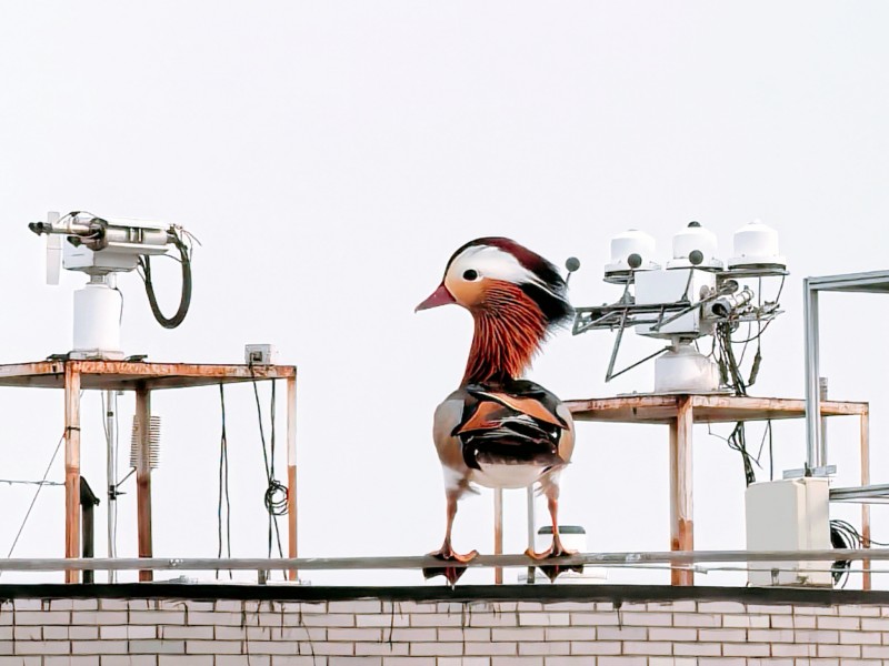 清晨在2号楼顶,偶遇一只对大气观测设备感兴趣的鸳鸯。(贾龙提供)