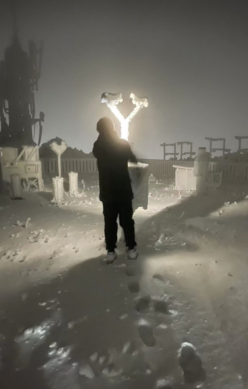 高海拔雨雪冰冻观测:大气所研究团队在湖南省高海拔山区开展雨雪冰冻观测,团队成员正在开展夜间观测设备维护。(李兴宇提供)