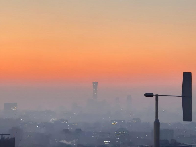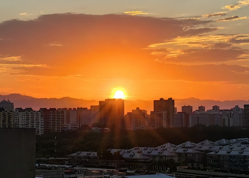 暮光楼影,摄于北京。夕阳跌进高楼间,云朵染上橙光,远山静默,城市披上温柔纱帐。(陶益凡提供)