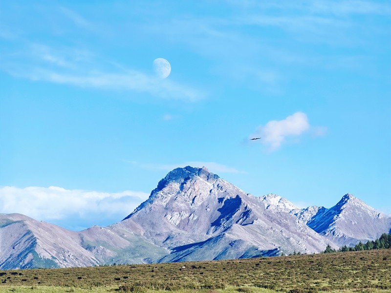 云抚雪山 月绘天境,摄于祁连山。湛蓝天空中,一轮明月高悬,几缕白云轻飘,飞鸟展翅翱翔。远处雪山连绵,雄浑壮丽。山脚下草地延伸,天地开阔,令人心生敬畏与向往。(陶益凡提供)
