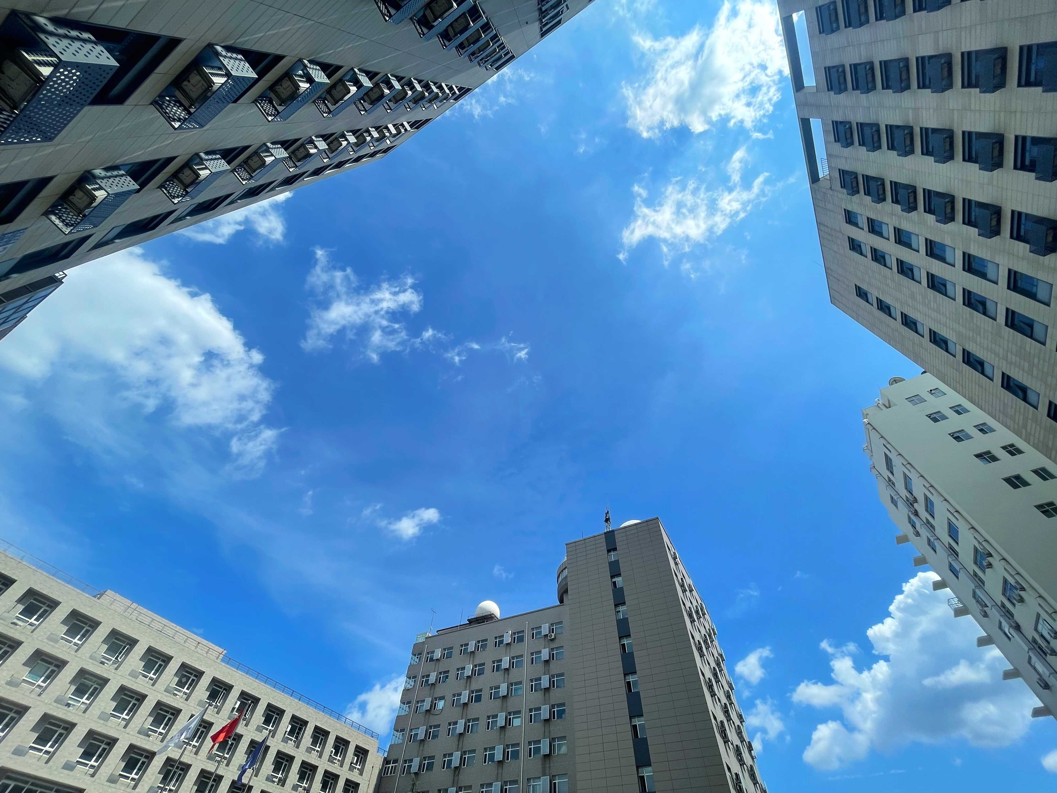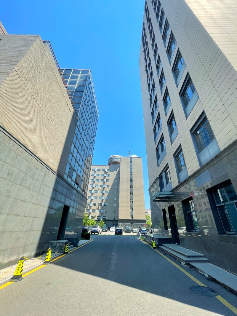 风云智境--大气所园区的建筑现代规整,道路延伸向远方的气象观测塔楼,如科技触角探入蓝天。见证气象研究与现代科技的深度交融。(王昭提供)