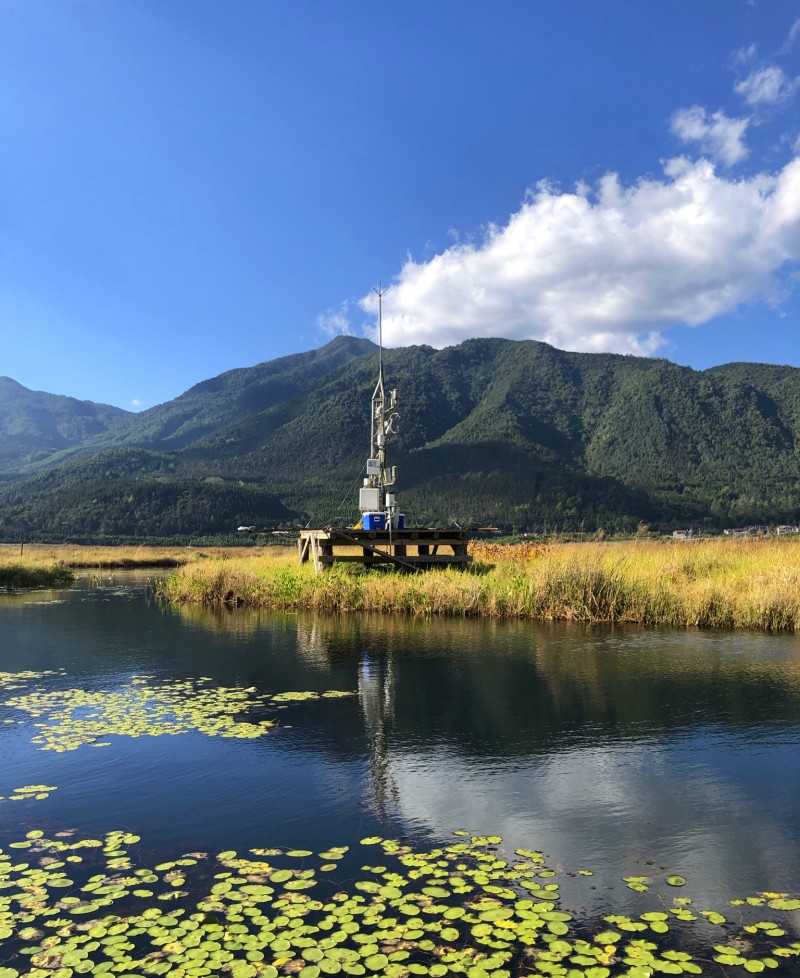 腾冲北海湿地观测点。该照片拍摄了云南腾冲北海湿地通量观测点。北海湿地下垫面同时分布有植被和水体,且植被、水体的比例呈动态变化,该观测点的建立为研究复杂地形下垫面非均匀性对地气交换过程的影响提供了数据支撑。(许鲁君提供)