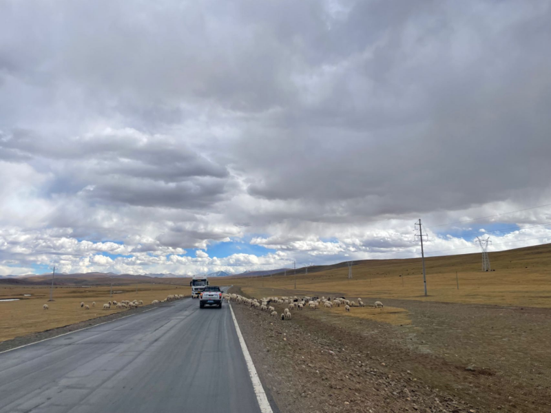 青藏公路上,一辆科考越野车静静停驻。白漆车身倒映着流云,挡风玻璃前,数百只藏羊正踩着碎步横穿柏油路面,铜铃清响漫过荒原。羊群绒毛在高原风中翻涌如浪,老牧人扬起的乌尔多抛石绳在半空划出弧线,惊起岩鸽掠过云层。此时天地澄明,唯有经幡与白云同步游移,金属车壳与温热血脉共同聆听亘古的风吟。(周敏强提供)