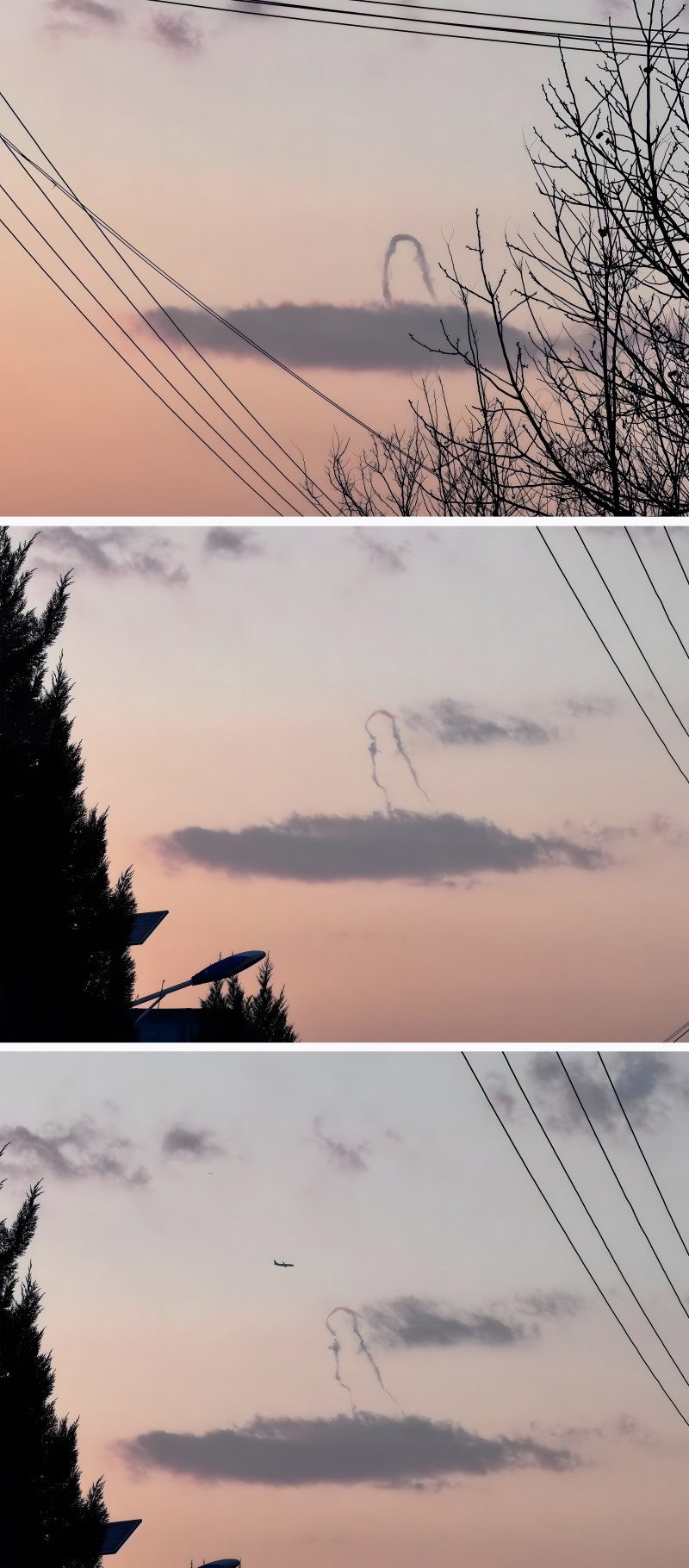 2025 年3月17日傍晚手机拍摄于济南市区槐荫区政府附近。 经确认,前后几天,当地气象、科研单位及部队均未进行包括火箭、火炮等业务活动,故这大概率为自然成云现象。感慨于大自然的鬼斧神工。(陈彬提供)