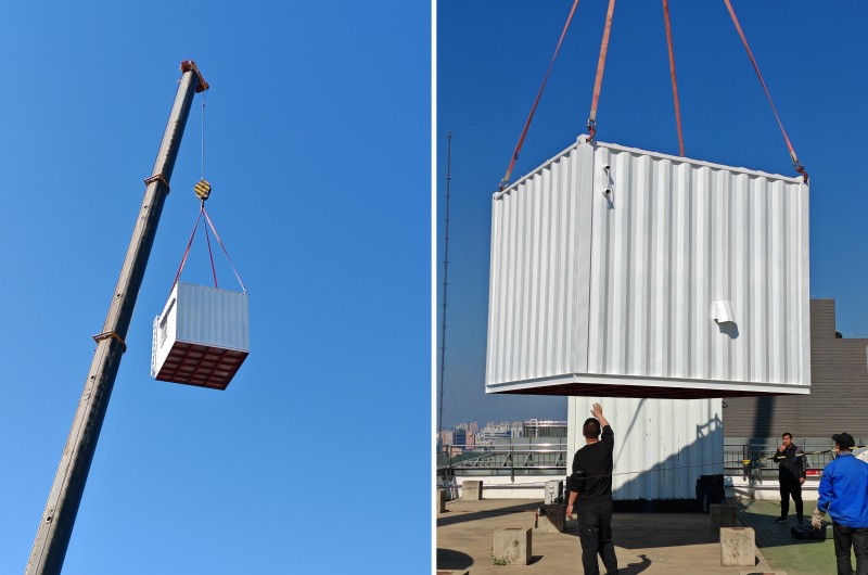 根据观测研究需要,在3号楼楼顶实施了实验方舱吊装,保障了后续的观测试验顺利开展。(韩鹏飞提供)