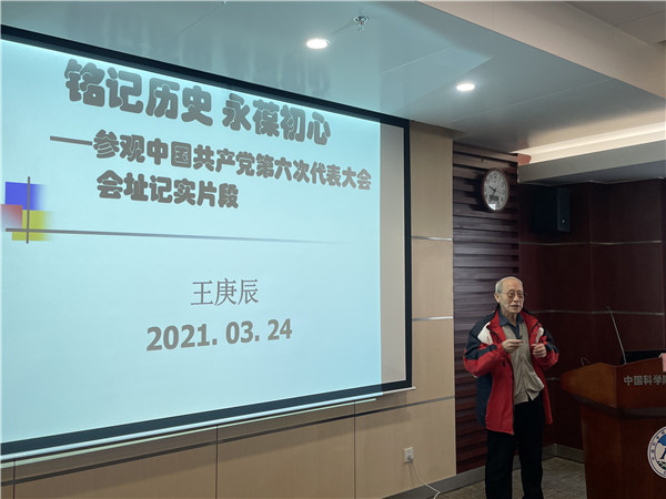 会议邀请王庚辰研究员作专题报告《铭记历史、永葆初心-参观中国共产党第六次代表大会会址纪实》。王庚辰于1965年毕业于前苏联列宁格勒水文气象学院,长期以来从事大气物理、大气探测和大气环境等方面的研究,大气成份探测、大气臭氧和大气气溶胶以及大气环境污染等方面取得了显著的研究成果。