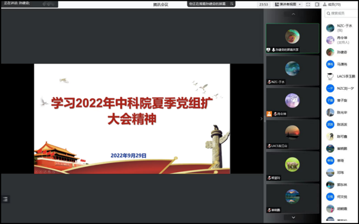 2022年9月27日,支部组织了“喜迎二十大 奋进新征程”党史时政知识竞赛。支部党员同志踊跃参加,在竞赛中学习巩固了党史、时政等方面的知识。2022年9月29日,为了更好地学习和弘扬老科学家精神,NZC党支部组织支部党员在线共同观看了以叶笃正先生为原型的微电影《科技脊梁:叶笃正》。同日,与LACS党支部联合举办了党课报告会,党委委员孙建奇研究员做了题为《学习2022年中科院夏季党组扩大会议精神》的党课报告,报告会以视频形式开展。孙建奇主要围绕会议任务、内容和贯彻落实要求等方面对2022年中科院夏季党组扩大会议精神进行了详细的介绍和解读。会上,支部党员还深入学习了《中华人民共和国科学技术进步法》《习近平经济思想学习纲要》等文件精神。