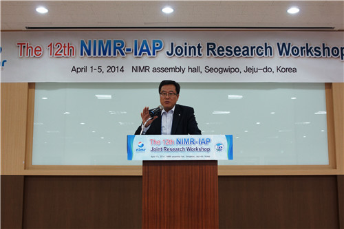 由韩国气象厅国立气象研究所和中科院大气物理研究所共同举办的第十二届中韩所际学术研讨会(The 12th NIMR-IAP Joint Research Workshop)于2014年4月1日-4日在韩国济州岛隆重举行。此次会议是韩国气象厅国立气象研究所于今年初整体迁往济州岛后在韩国召开的首次会议,大气所所长王会军院士率团赴韩国参加了此次研讨会。程新金副所长也参加了本次研讨会。