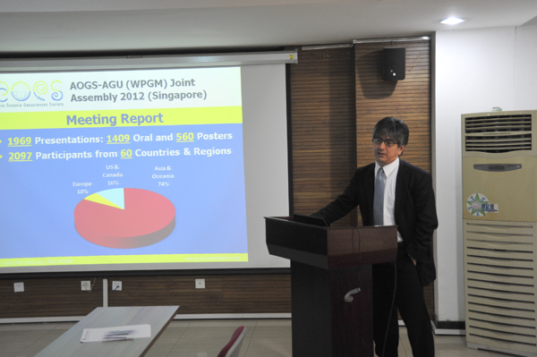 研讨会由IUGG中委会顾问陈运泰院士主持,AOGS主席Kenji Satake教授首先就AOGS发展历史、历届会议信息及新一届委员会组成等情况进行概述,其后,他对即将于2014年7月底在日本札幌举办的AOGS2014年大会筹备情况向与会人员进行介绍。IUGG中委会秘书长李建平研究员就IUGG中委会发展及中委会为申办AOGS2016年大会所做的筹备工作进行了全面细致的陈述。AOGS秘书长David Laurence Higgitt教授对IUGG中委会的发展以及为申办AOGS2016年大会所做的工作给予了高度肯定,并就会址考察状况提出意见,同时建议将美国地球物理学会(AGU)“西太平洋地球物理会议”(WPGM)与AOGS2016年大会共同召开,不仅能为AOGS成员与西太平洋地区的地学科学家提供交流与讨论的平台,同时也为确保我国科研工作与国际前沿科学的接轨和培养青年学者起到积极的推动作用。