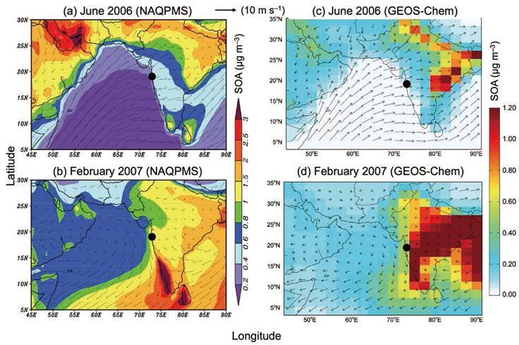 NAPQMS 和GEOS-Chem 模式模拟南亚地区二次有机气溶胶浓度。孟买NAPQMS 和GEOS-Chem 模拟夏季(图a 和c)二次有机气溶胶(SOA)的分子标志物浓度明显低于冬季(图b和d)。此结果与观测相符,揭示了印度洋夏季风对南亚大气有机气溶胶的显著影响。该成果于2016年发表于Environmental Science & Technology 杂志