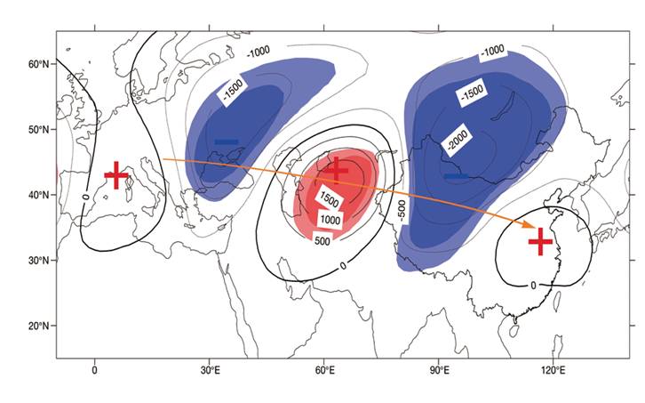 丝绸之路型大气遥相关波列。夏季沿欧亚大陆上空副热带急流存在有“丝绸之路”型大气遥相关,其变化不仅影响我国西北干旱区的热力与降水,也可以影响中亚和我国东部季风区夏季降水的年际变化。该图为7 月份西北干旱区感热EOF2(东西相反型)时间系数与200 hPa 高度场的相关系数(阴影区)分布图,实、虚线表示高度场对时间系数的回归分布,风场数据来自ERA-Interim 再分析资料